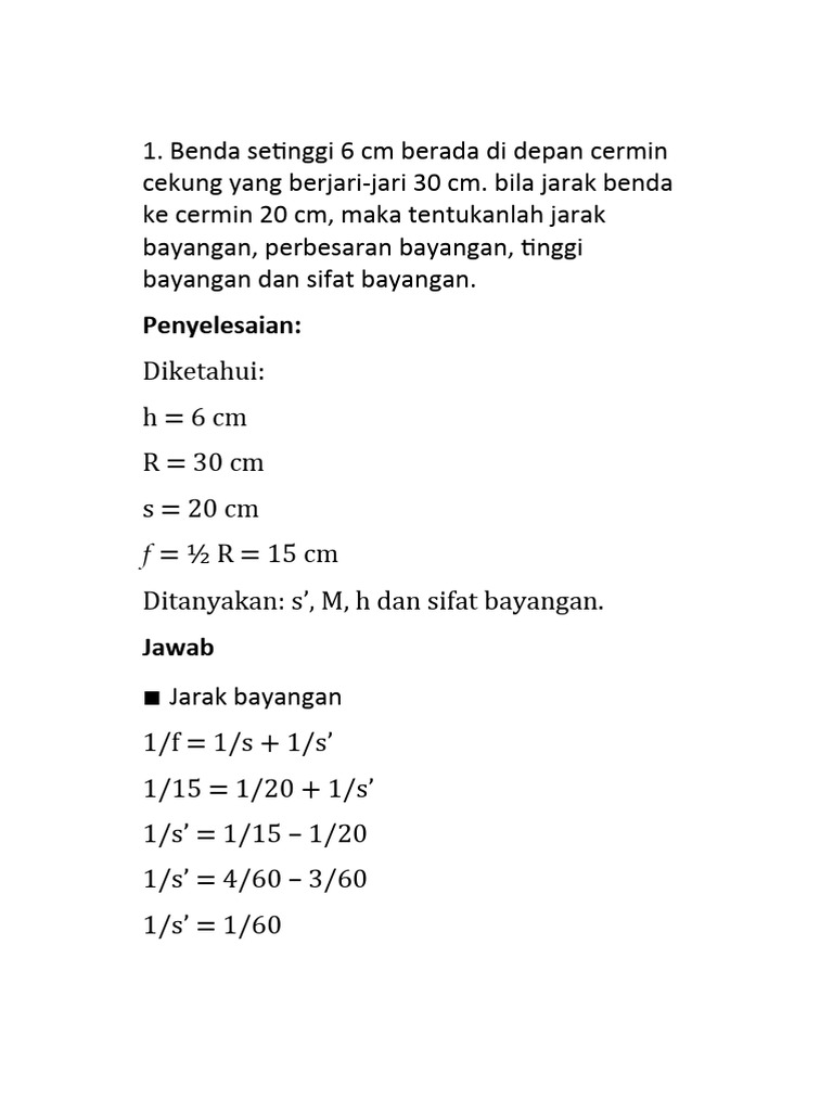 Tinggi bayangan benda adalah 5 cm. Tanda negatif pada tinggi bayangan menandakan bayangan terbalik.